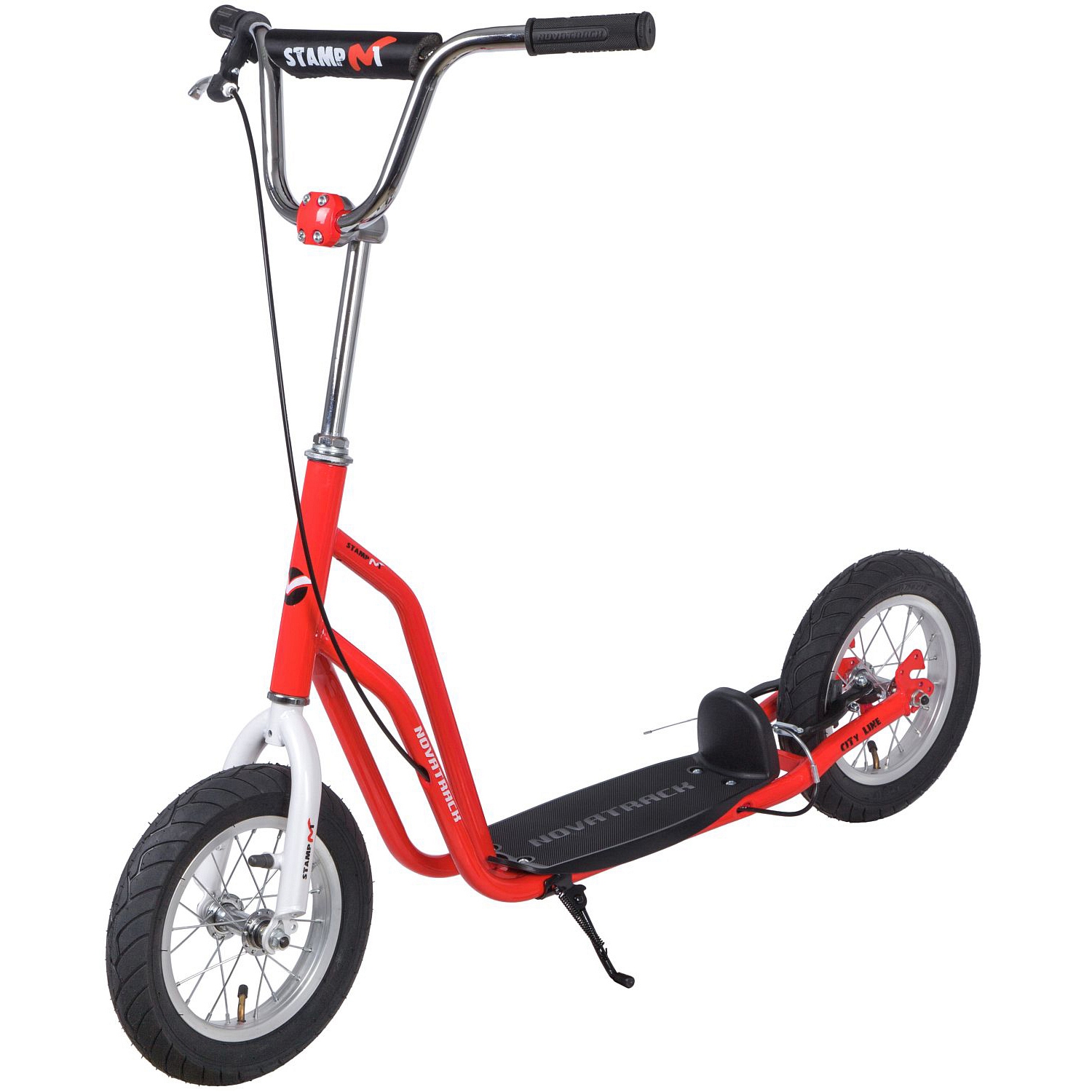 Самокат Novatrack STAMP N1 порадует всех любителей активного образа жизни от самых маленьких до более опытных. Широкие надувные колеса диаметром 12 дюймов позволят кататься не только по асфальтовым дорожкам, но и с легкостью преодолевать парковые тропинки. Надежные передний и задний ручной тормоз обеспечивают безопасное торможение даже с очень крутой горки. Надувные колеса имеют ряд ощутимых преимуществ. Они бесшумны, с мягкими колёсами поездка будет мягче и комфортнее. Хорошо защищают от неровностей благодаря амортизирующим свойствам. Такие колёса комфортны при езде по неровным дорогам. В дождливую погоду надувные колеса увереннее держатся в поворотах. Они отлично тормозят и не скользят на разных поверхностях. Благодаря отличному сцеплению, помогают развивать более высокую скорость.