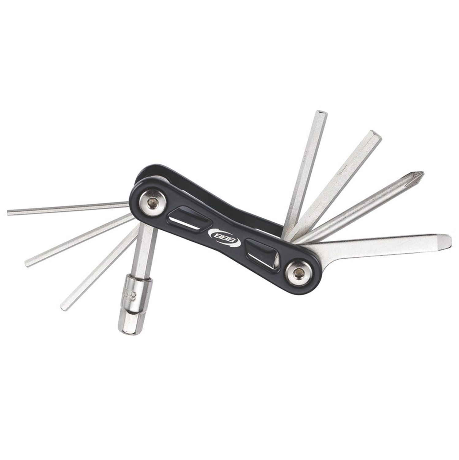 Прочный мультитул с легким алюминиевым корпусом станет полезным помощником для велосипедиста, который всегда с собой. Двойной шестигранный ключ не будет сниматься во время использования. Многофункциональный инструмент оборудован 9 функциями шестигранные ключи 2, 2.5, 3, 4, 5, 6 и 8 мм. Крестовая и плоская отвертка.