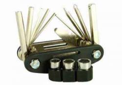 Компактный мультитул с набором шестигранников и накидных головок. Выполнен из стали с пластиковой рукояткой.