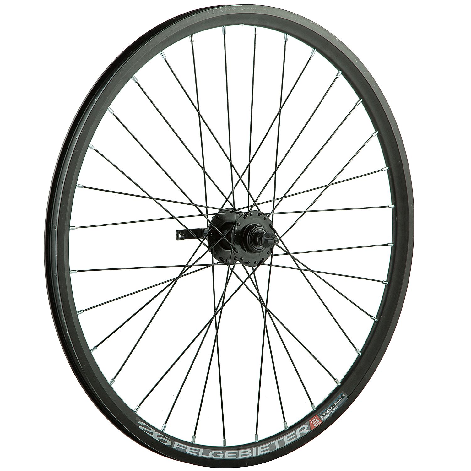 Колесо 26 переднее без резины, двустенный алюминиевый обод. Количество отверстий под спицы - 32 шт. Втулка STG A25 стальная, тип крепления ротора - 6 болтов. Ось - эксцентрик.