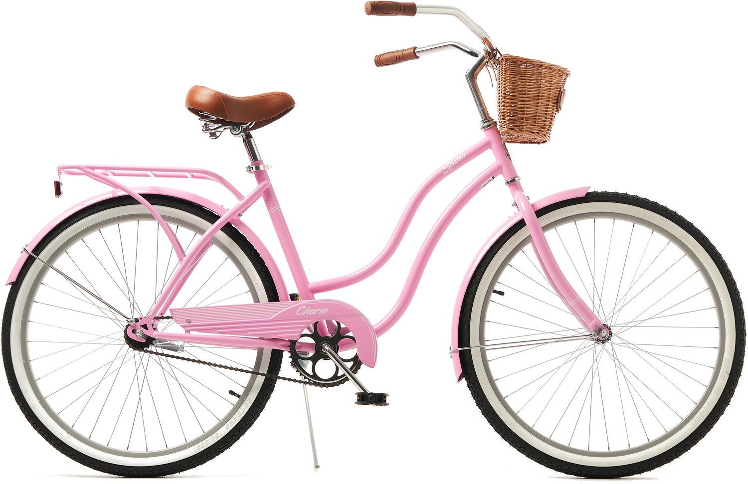 Велосипед оснащён 26-дюймовыми колёсами с покрышками Spinn Tire 26x2.125" с белыми полосами, что придаёт ему стильный и элегантный вид. Задний ножной тормоз добавляет удобства и безопасности. В комплект входят крылья, багажник и звонок, что делает Charm готовым к использованию прямо из коробки.