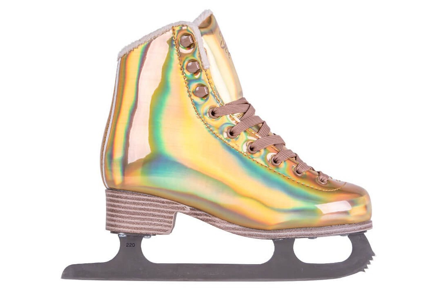 Яркие женские фигурные коньки, в которых вы точно не останетесь незамеченными! Ботинок коньков выполнен из искусственной кожи с галографическим эффектом и переливается разными цветами. Подкладка ботинка изготовлен из синтетического меха.