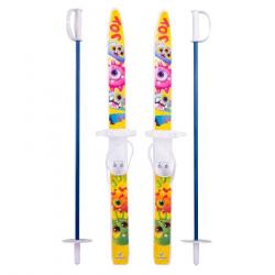 Комплект оснащён удобными пластиковыми креплениями, которые подходят для повседневной обуви. Глубокие пластиковые ремешки надёжно фиксируют ногу, обеспечивая безопасность и комфорт во время катания. Алюминиевые лыжные палки с пластиковыми травмобезопасными наконечниками снижают риск травм, что особенно важно для маленьких лыжников.