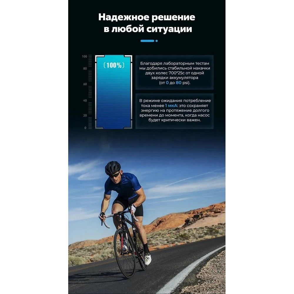 Сверхкомпактное устройство для спортсменов, которое поможет быстро накачать покрышку велосипеда. Является отличной заменой баллончикам с CO2. Сверхкомпактный корпус (помещается в карман джерси). Ультралегкий (97 грамм). Максимальное давление 100 psi. Универсальный (для Schrader и Presta, адаптеры в комплекте). Батарея 300mAh / 7.4V. Зарядка по кабелю USB Type-C (5V / 1.5A). Время полной зарядки 20 минут (с устройством Quick Charge). Беспрерывная накачка в течение 200 секунд. Силиконовый чехол.