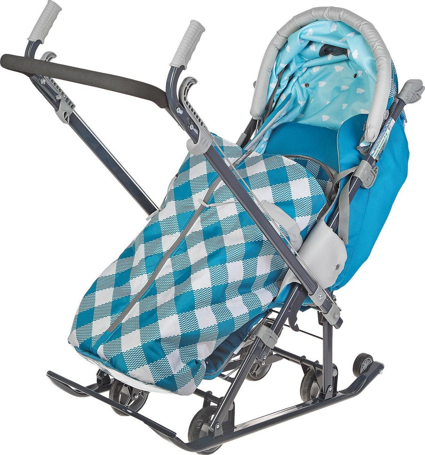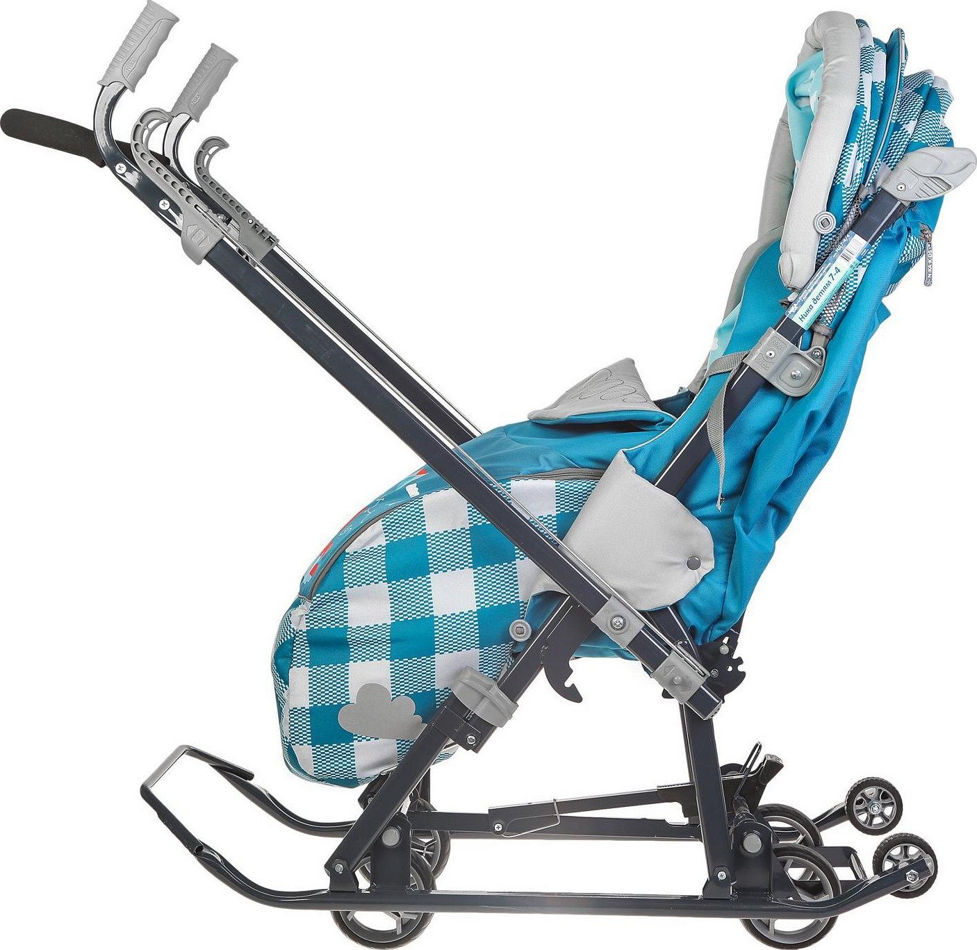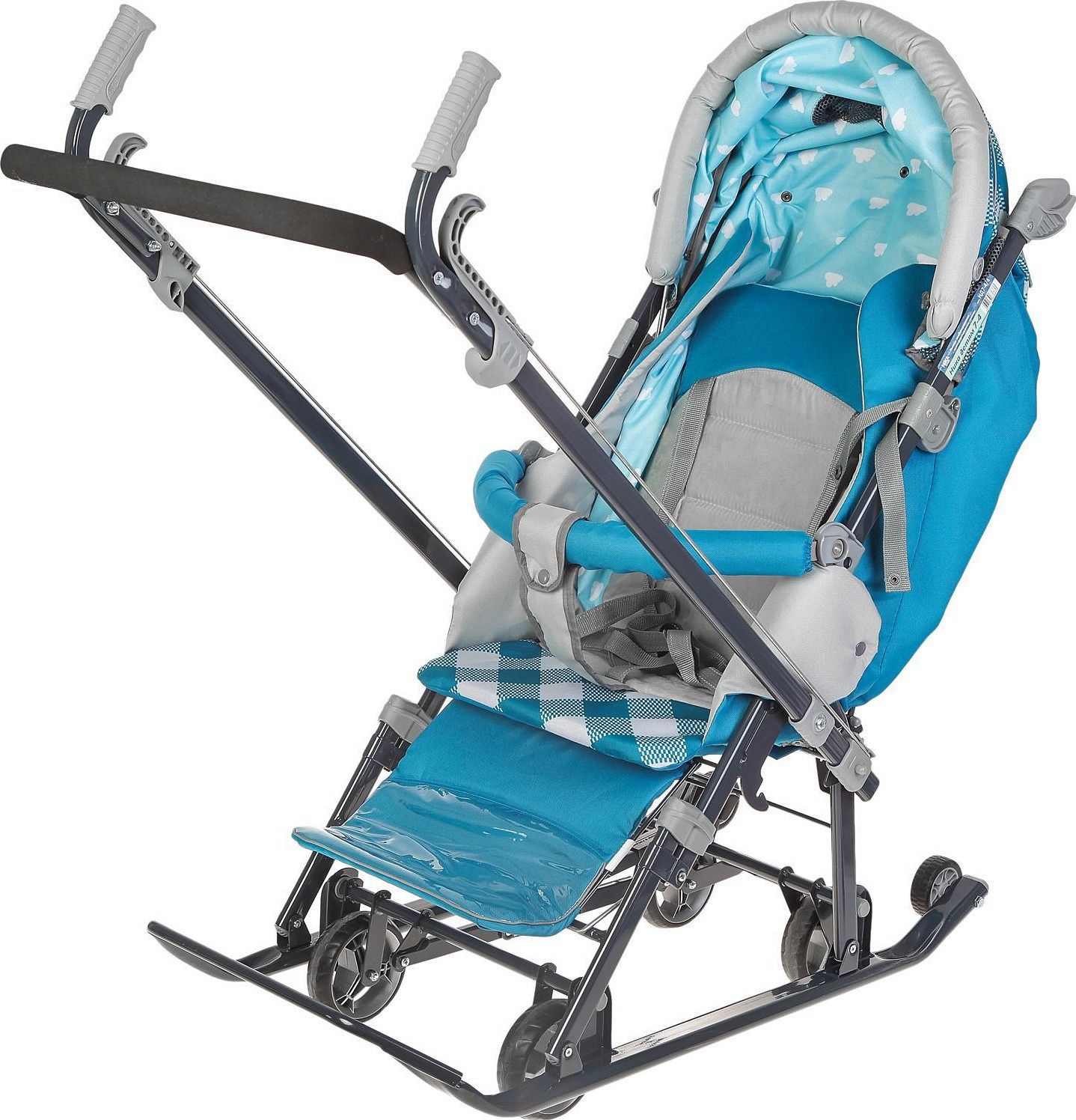 Дополнительно кузов трансформируется, а плоские полозья шириной 40 мм и высокопрочный стальной каркас гарантируют надёжность. Подножка для ног с регулируемым углом наклона позволяет ребёнку комфортно вытягивать ножки в положении лёжа. Бампер, обтянутый тканью в цвет чехла, и яркий рисунок на чехле придают изделию стильный внешний вид.