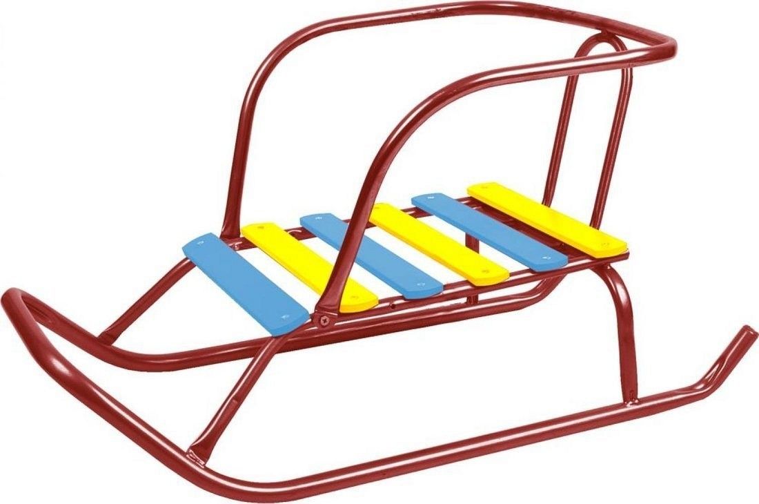 Классические санки для катания и перевозки детей. Материалы: каркас – металл, сидение – деревянные рейки.