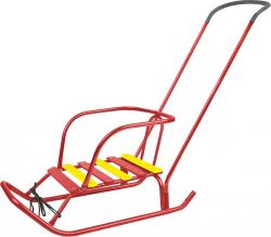 Металлические санки со съемной спинкой и родительской ручкой-толкателем для катания и перевозки детей.