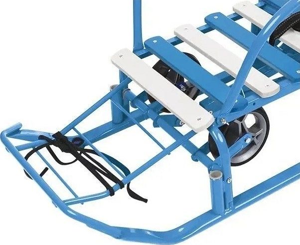Основой конструкции служит металлический каркас с антикоррозийным покрытием, что гарантирует долговечность и устойчивость к внешним воздействиям. Плоские полозья обеспечивают плавное скольжение по снегу, а механизм выдвижных колёсных шасси позволяет легко переключаться на колёса для передвижения по твёрдым поверхностям.