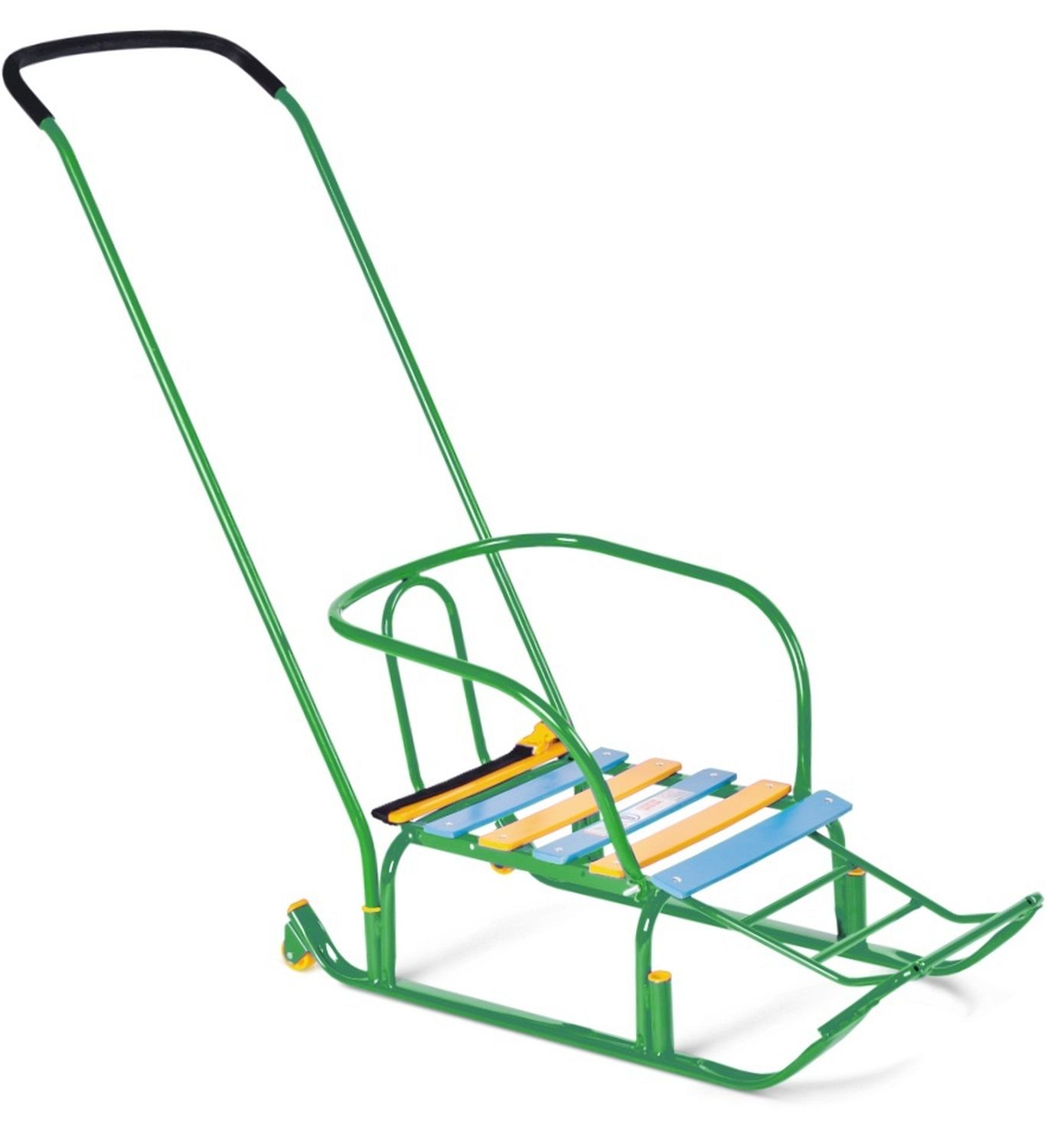 Функциональные и практичные санки от российского производителя придутся по душе любому малышу. Они имеют прочный металлический каркас, удобную спинку и сиденье из деревянных реек. Впереди имеется подставка для ног. Санки можно доукомплектовать мягким сиденьем. Также санки комплектуются веревкой, чтобы возить за собой. Компактные размеры позволяют хранить их даже в небольшом шкафу. Родительская ручка удобна в использовании. Ремень безопасности надежно зафиксирует малыша.