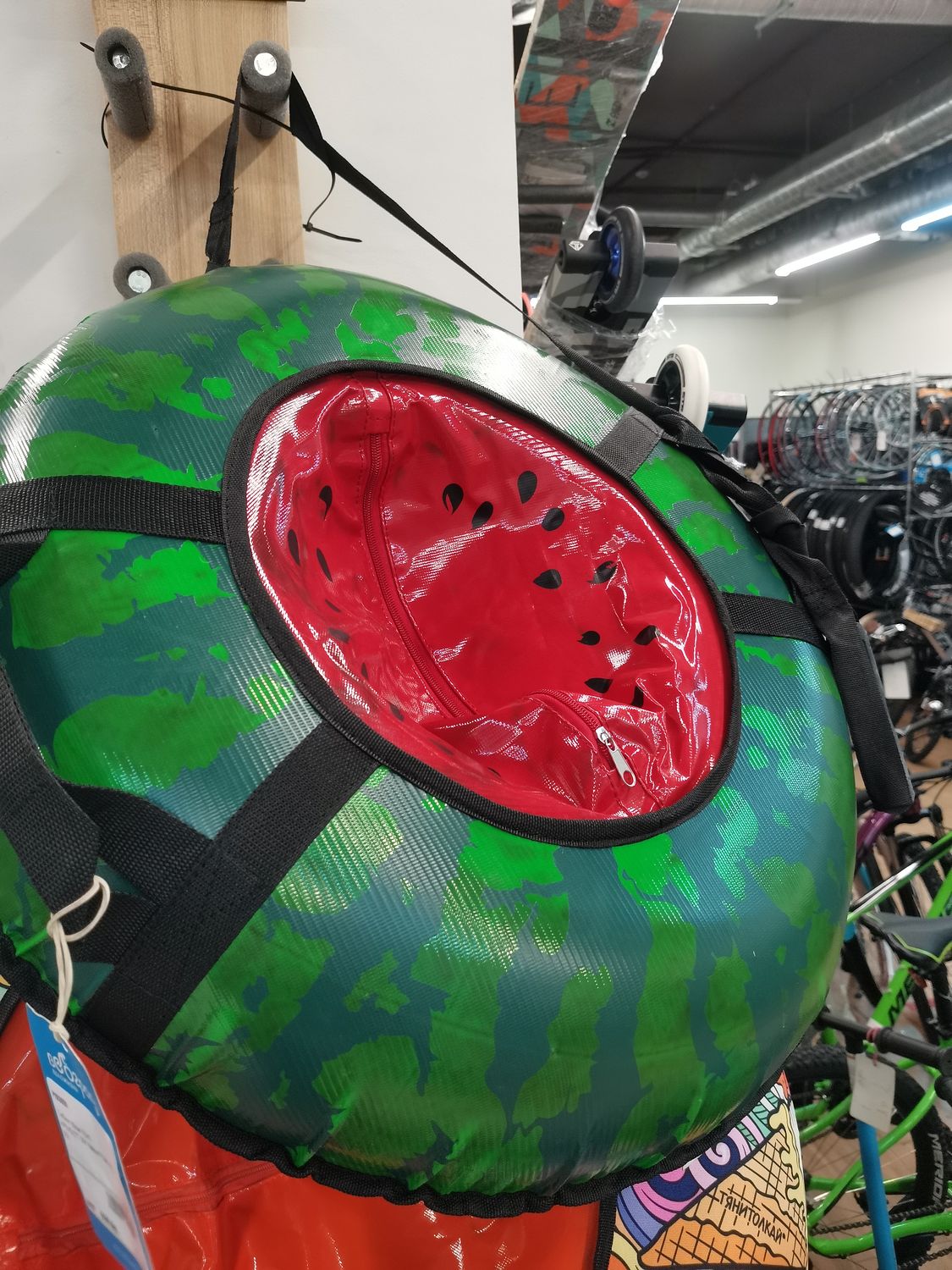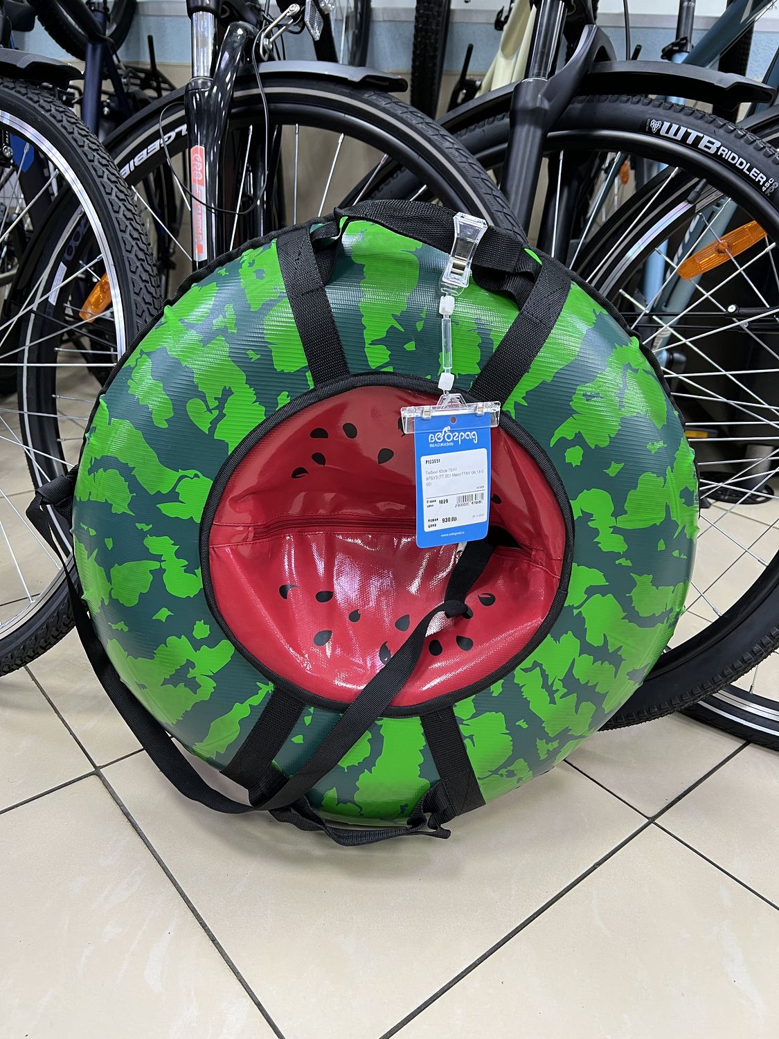 Тюбинг ТЕНТ АРБУЗ 65см подойдет для активного отдыха. Изготовлен из влагозащитного материала, устойчивого к морозам. Для комфортного использования имеются удобные ручки и буксировочный трос.